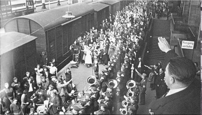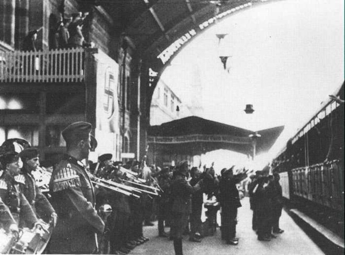 Fanfare et salut hitlérien pour souhaiter un bon retour aux réfugiés. La propagande nazie ne recule devant aucun stratagème pour amadouer les Alsaciens.
