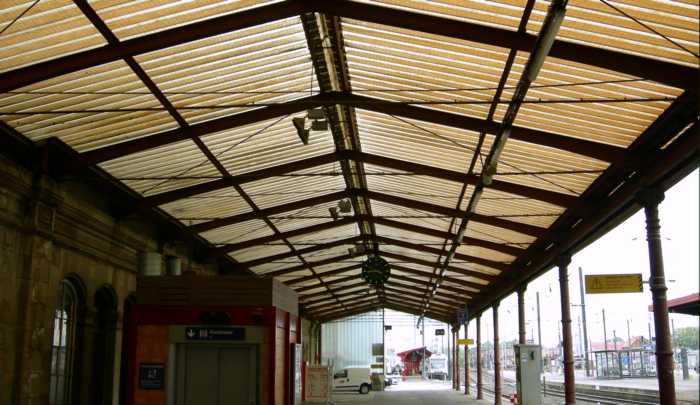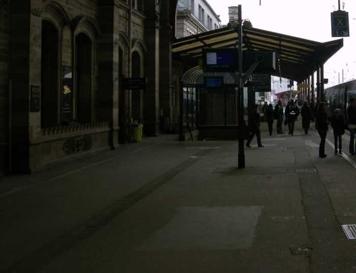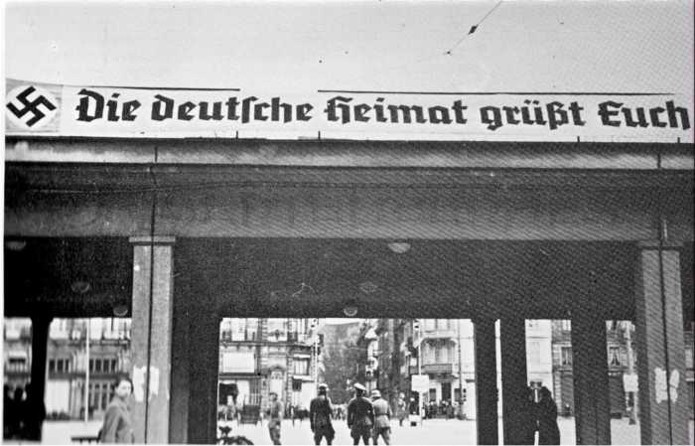 Cette banderole de propagande est placée sous un abri de quai en gare de Strasbourg. Le texte est sans ambiguïté « Strasbourg l’allemande vous souhaite la bienvenue ».