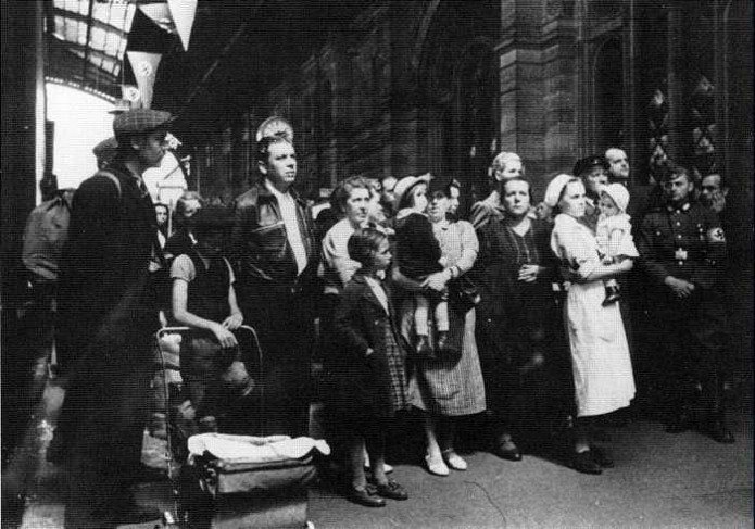 Les visages sont graves. Assommés de fatigue par un long trajet de retour en wagons à bestiaux, les Alsaciens ne réalisent pas que les mâchoires de l’étau nazi commencent à se refermer sur eux. Pour exemple, les enfants devront apprendre l’allemand à l’école. Parler français deviendra un délit. Les prénoms et les noms seront germanisés. Au deuxième plan, le civil portant un béret ne sait pas encore que le fait de porter ce type de coiffure sera bientôt un délit passible d’un séjour en camps de concentration.