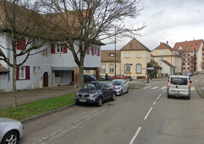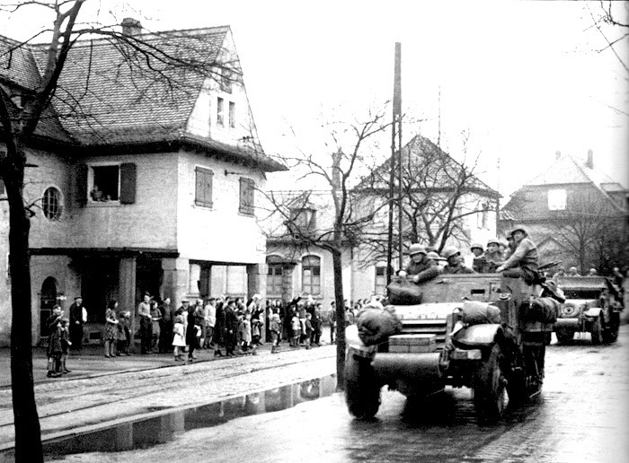 Des half-tracks de la 2e section de la 11 cie du Régiment de Marche du Tchad (RMT), dont le half-track du caporal-chef Joussaune 410768 « Infanterie de Marine » circulent dans les quartiers situés au sud du centre de Strasbourg . Nous sommes à la hauteur du 2 allée docteur Goldschmidt.