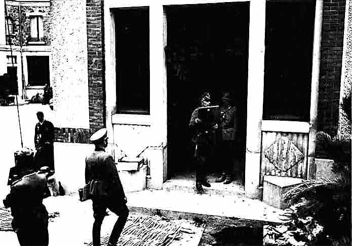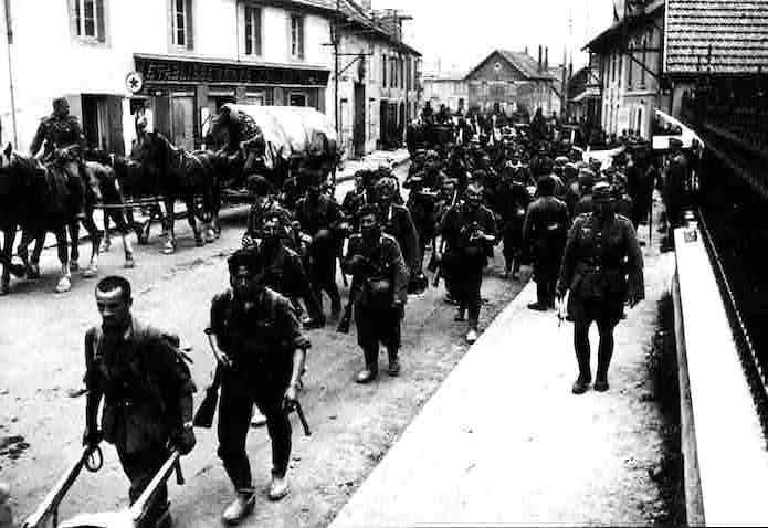 Peu de temps après, c’est l’infanterie à pied accompagnée de son charroi qui va traverser la localité. La progression se fait au rythme lent du pas des chevaux. On est loin de la progression rapide des unités de Panzer. Les bottes sont poussiéreuses et la fatigue se fait ressentir sur les visages. Au premier plan, un fantassin pousse même une brouette.