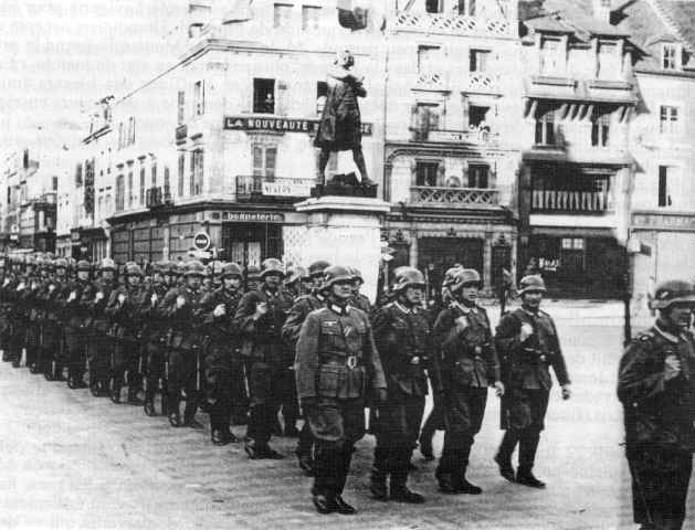 Durant l’occupation, les autorités allemandes organiseront de nombreux défilés pour montrer la puissance omniprésente de la Werhmacht. Un détachement allemand parade place Mirabeau.