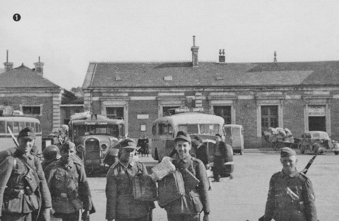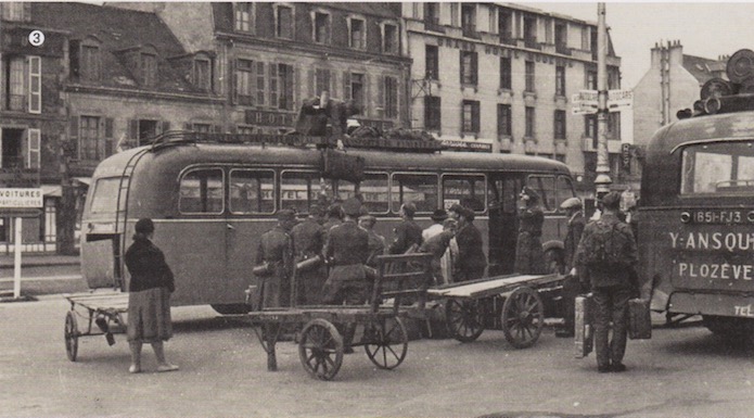 A peine débarqué du train qui les a emmenés à Quimper, les militaires allemands chargés de leur paquetage prennent les dessertes locales pour rejoindre leur lieu de stationnement.