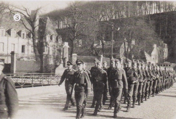 Une unité composée d’artilleurs de la Flak 153 défile sur l’ancienne place du Champ de Bataille rebaptisée après guerre en Place de la Libération .