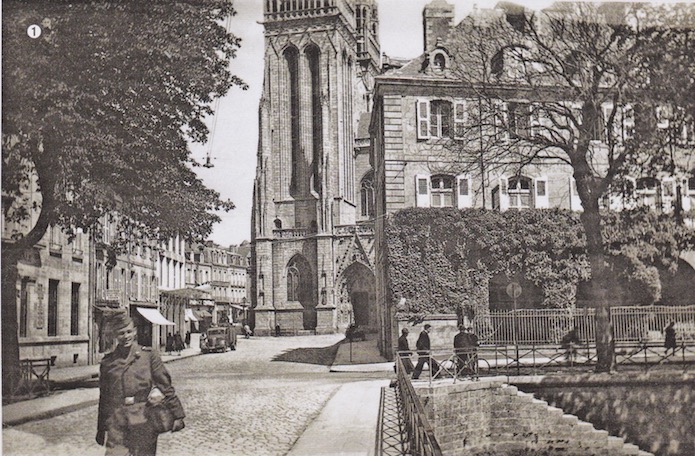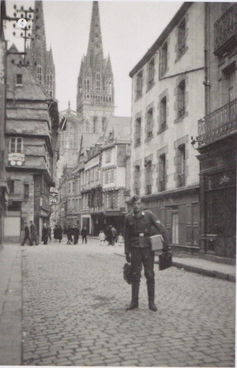Rue mythique de Quimper, ce Gefreiter s’est fait photographier alors qu’il vient de faire des achats en vue de son départ en permission. Il est vrai que le très bas taux de change imposé par l’administration allemande permet de « piller » les magasins de luxe ou de gastronomie fine à moindre frais. « Douce France »