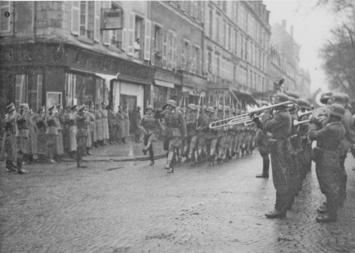 La musique du 365e régiment d’infanterie donne un concert sur le trottoir du Café de l’Epée. Pour les autorités allemandes ce type de manifestation devait permettre un rapprochement entre occupants et occupés.