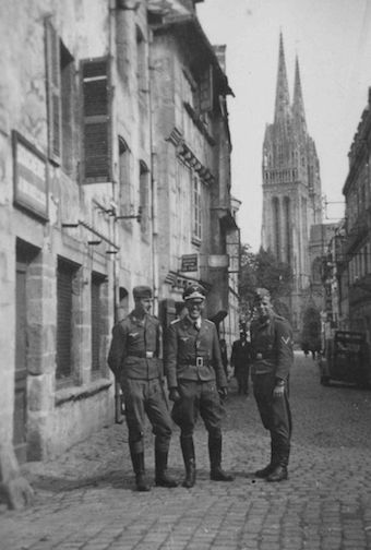 Les rues du vieux Quimper sont particulièrement prisées par les militaires allemands en promenade. Ils n’hésitent pas à se faire photographier en souvenir de leurs passages dans la ville. Ces trois personnels de la Luftwaffe en tenue de sortie dont un pilote ne dérogent pas à cette tradition.
