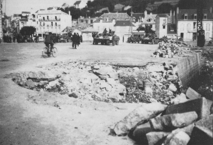 Photographie des quais d’Audierne détruits par les mines le 4 août 1944.