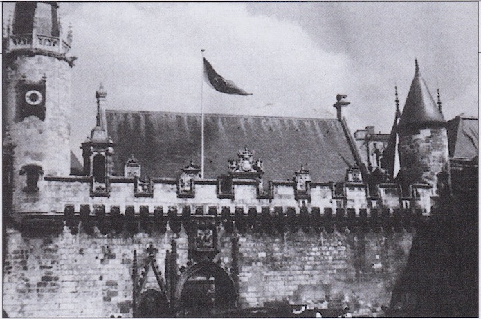 Le pavillon à svastika flotte sur l’hôtel de ville. La statue d’Henry IV a été retiré du campanile par les forces d’occupation.
