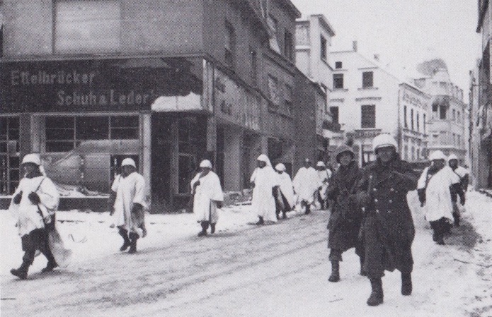 La ville d’Ettelbruck tomba aux mains des Allemands le 21 décembre 1944. Les troupes américaines du 11th Regiment, 5th Infantry Division traverse la ville après sa reconquête en date du 24 décembre. Les fantassins ont parfait leur camouflage hivernal en utilisant des draps de lit retaillés en chasuble.