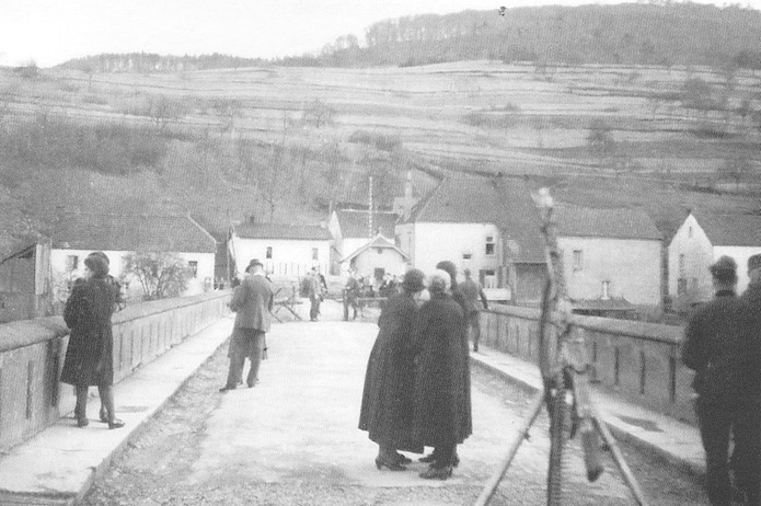8 mai 1940 : De curieux touristes se répandent sur le pont de la Sûre et observent les chicanes construites par les Luxembourgeois.