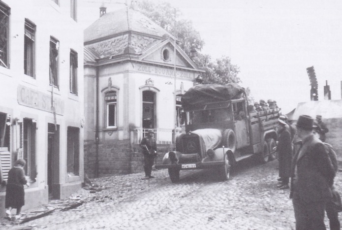 Un camion de Mercedes-Benz LG63/LG3000 6x4 transportant un groupe de combat entre au Luxembourg. Il appartient vraisemblablement à la 10. Pz-Div.
