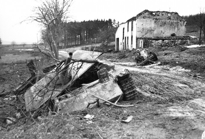 Au premier plan, on voit un Jagdpanzer IV/70 dont le haut de caisse est désolidarisé du châssis par une forte explosion interne. Au second plan, on aperçoit un canon antichar Pak 40 de 75mm lui aussi fortement endommagé.