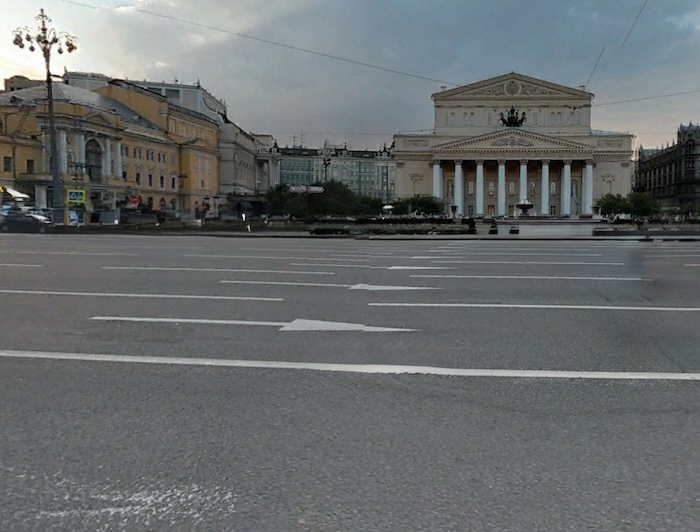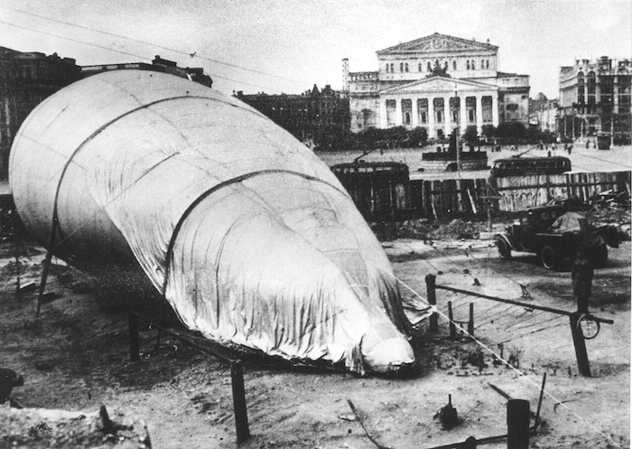 On voit ici un ballon de barrage de Moscou installé sur le boulevard Tver, près du théâtre du Bolchoï. Pour défendre la ville, en plus des chasseurs, des canons antiaériens et des ballons de barrage, un vaste plan de camouflage fut mis en œuvre. De fausses usines furent construites, les murs du Kremlin repeints pour imiter des façades d’habitations, le mausolée de Lénine recouvert de sacs de sable, et certaines routes furent même peintes pour donner l’illusion de toits vus du ciel.