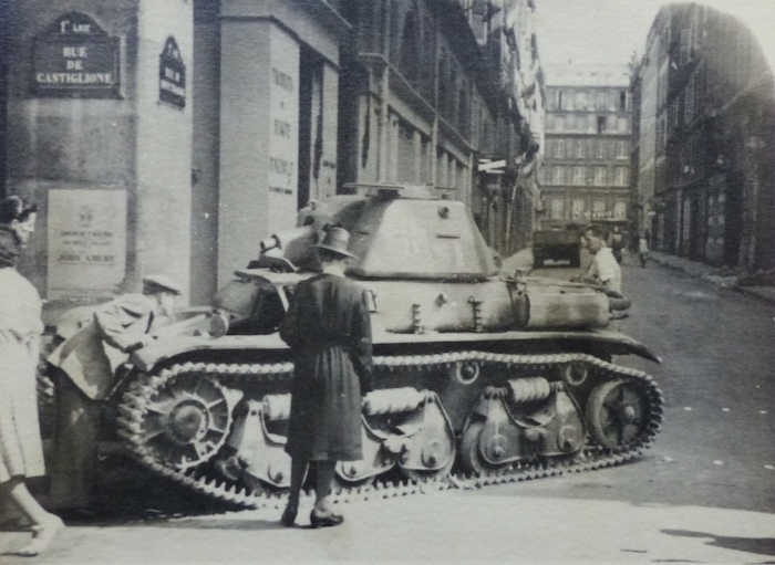 Epave d’un Renault R35 détruit lors des combats pour la Libération de Paris en Août 1944.