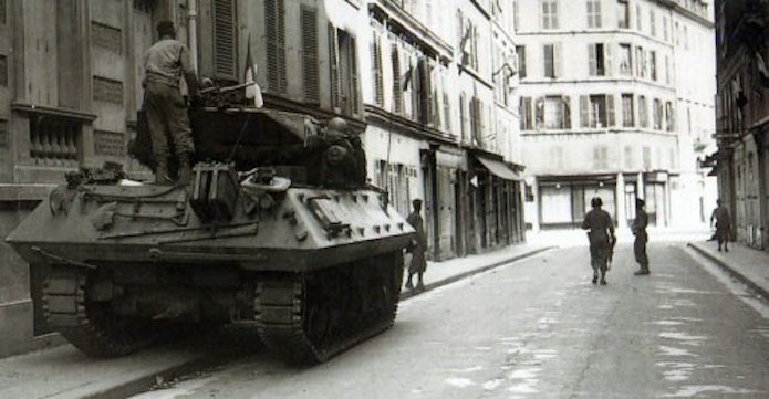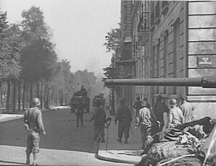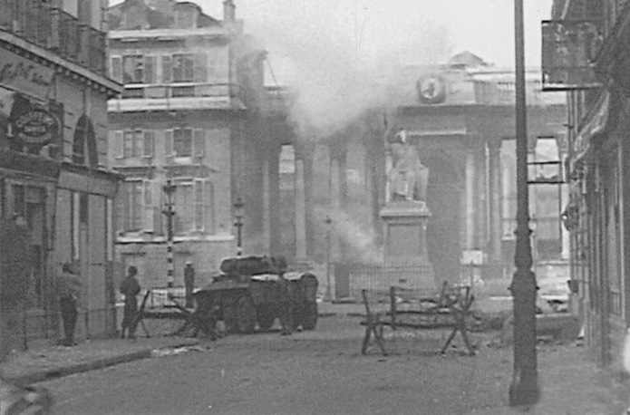 25 août 1944, rue de Bourgogne, des éléments du 5e escadron du 1er RMSM soutenus par une M8 progressent entre les chevaux de frises censés interdire l’accès à la place.