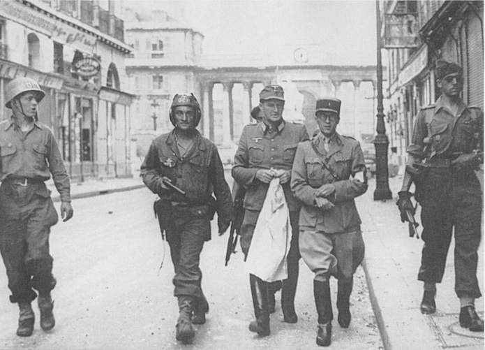 Rue de Bourgogne : négociation de reddition des forces allemandes combattant dans le bâtiment et à ses abords. Un lieutenant allemand ,sous couvert d’un drapeau blanc, est pris en charge par des hommes de la 2eDB . Le tankiste du premier plan, armé d’un Colt aborde l’étoile du 1er RMSM.