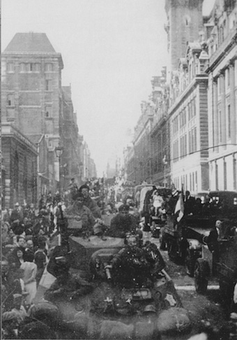 26 août 1944. Sous les acclamations des parisiens, le défilé arrive sur le parvis de l’hôtel de ville. On aperçoit des jeeps, un Dodge command car et des chars légers Stuart M5.