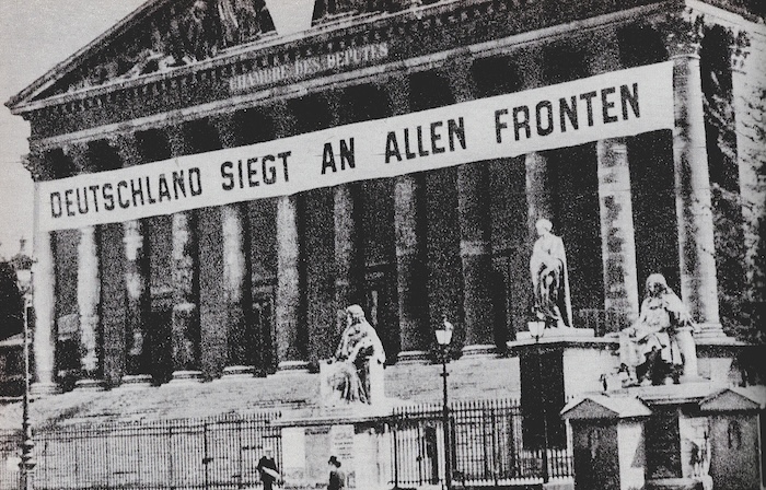 Le message, visible de tous, affirme la supériorité militaire allemande. « L’Allemagne est victorieuse sur tous les fronts. »