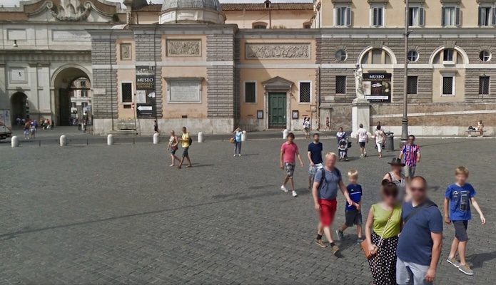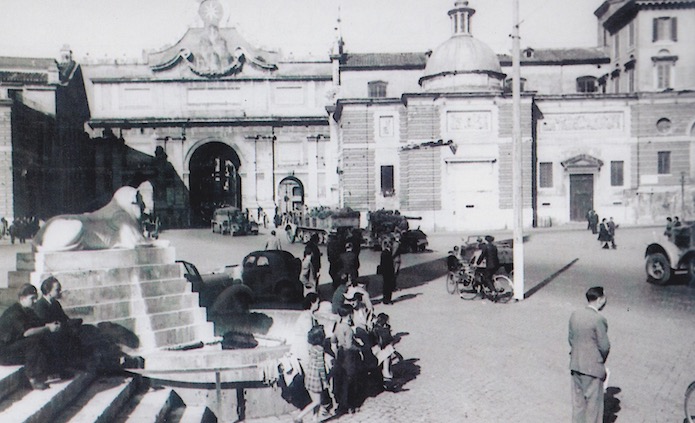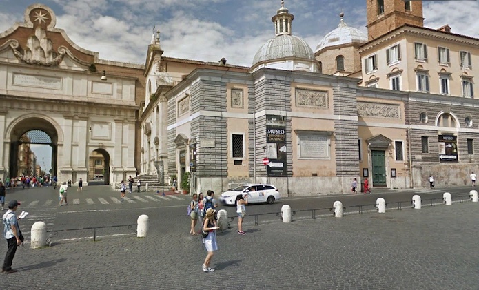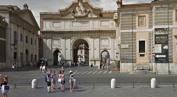 La colonne arrive sur la Piazza del Popollo en passant sous la Porta del Popollo.