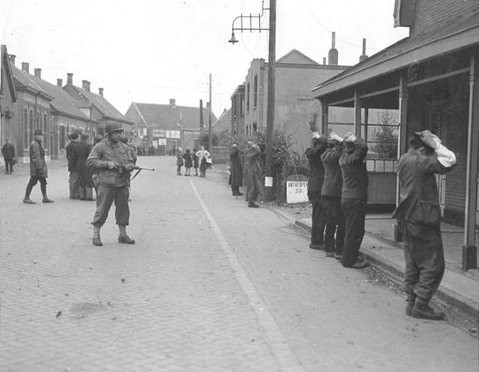 Le samedi matin 28 octobre 1944, vers sept heures et demie, Les colonnes motorisées de la 104th US Infantry Division « Timberwolves » entrent dans Rijsbergen. Un bon nombre de soldats allemands sont capturés. Sur la photographie, six prisonniers allemands, mains sur la tête et nez contre le mur sont surveillés par un soldat américain sous le regard de civils nouvellement libérés.