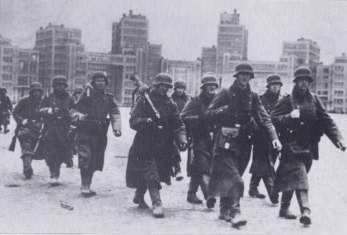 Novembre 1941. Des fantassins allemands passent devant la « maison de l’industrie lourde » sur la Place Rouge. Ils ne semblent pas avoir touchés d’effets vestimentaires spéciaux , hormis une longue capote pour lutter contre le froid.