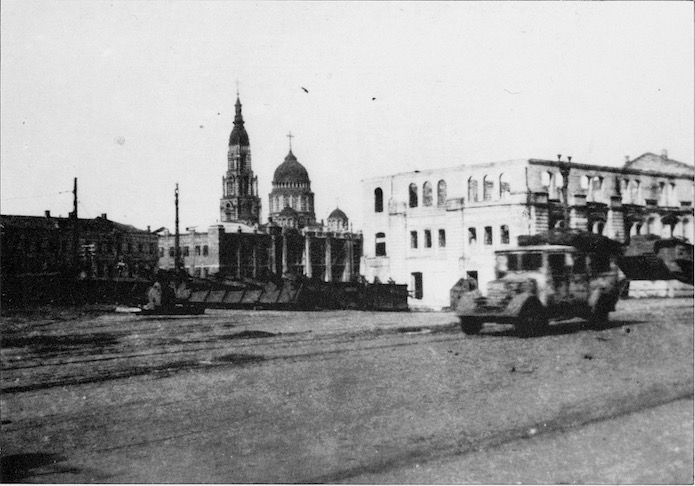 Malgré les efforts de l’Armée Rouge, Kharkov est toujours aux mains des Allemands au début de l’hiver 1942-1943. Sur cette photographie prise par un correspondant allemand, on peut voir un des hauts lieus de la ville, l’église Saint-Michel. Rebaptisée, elle est devenue la Cathédrale de l’Annonciation