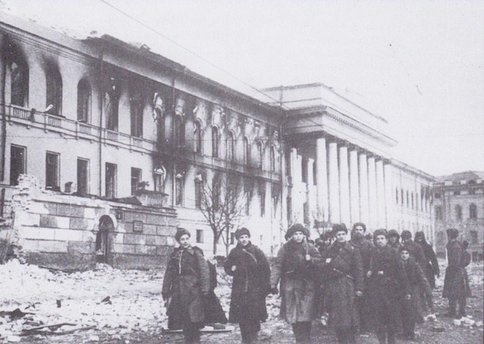 Le 6 décembre 1943, les Soviétiques entrent dans Kiev. Un groupe de fantassins passe devant les bâtiments incendiés de l’université.