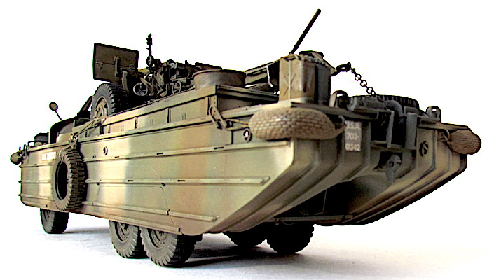 En 1940, 18 mois avant l’entrée en guerre des Etats-Unis , Franklin D. Roosevelt fait mettre sur pied le National Defense Research Committee, auquel succède, un an plus tard, l’Office of Scientific Research and Development (OSRD), dirigé par l’ingénieur Palmer C. Putnam. Une équipe de l’OSRD est alors chargée de l’étude de véhicules amphibies permettant de transférer rapidement des combattants, des armes lourdes, du matériel et du ravitaillement depuis des navires de transport vers une plage de débarquement. Partant de l’AFKWX-353 de 2 ½ tonnes, une variante du camion militaire 6x6 CCKW-353 de la Yellow Truck & Coach Compny, de Pontiac, dans le Michigan, les ingénieurs américains dessinent autour de celui-ci une coque métallique, et ajoutent une hélice dans un semi-tunnel à l’arrière, ainsi qu’un gouvernail, pour assurer la propulsion et la direction dans l’eau. La coque du DUKW est en tôle d’acier soudées et d’épaisseur variable ; 3,2 mm à la proue, 2,4 mm sur la face ventrale, 1,6 mm sur les côtés. A terre, le véhicule se déplace sur six roues motrices, entraînées par un moteur à essence de 94 chevaux. D’un diamètre de 63,5 cm, l’hélice est actionnée par le même moteur. La charge utile varie de 2 270 à 4 540 kg de fret selon les conditions de mer, ou consiste en 25 combattants complètement équipés et accompagnés de 700 kg de munitions. Le DUKW peut aussi transporter des pièces d’artillerie dont la taille et le poids maximaux correspondent à ceux de l’obusier de 105 mm M2. En outre, trois palettes peuvent prendre place dans le compartiment cargo. La cargaison doit être soigneusement équilibrée, particulièrement pour les déplacements dans l’eau. En cas de nécessité, le DUKW peut emmener 12 blessés sur des civières, ou jusqu’à 40 blessés capable de marcher. Bien qu’au début, les divisions de Marines et certaines divisions de l’US Army n’utilisent le DUKW-353 que pour leur appui logistique, à partir de novembre 1943, il est de plus en plus employé comme engin d’assaut. Il est vrai qu’il est capable d’affronter des vagues pouvant atteindre 3 m et se déplacer sur le sable.