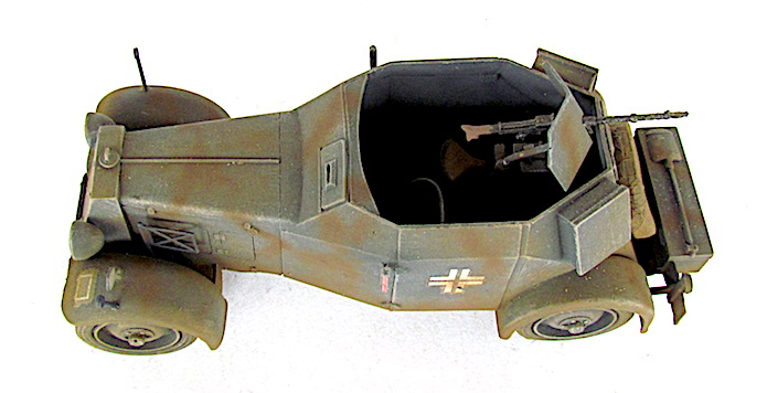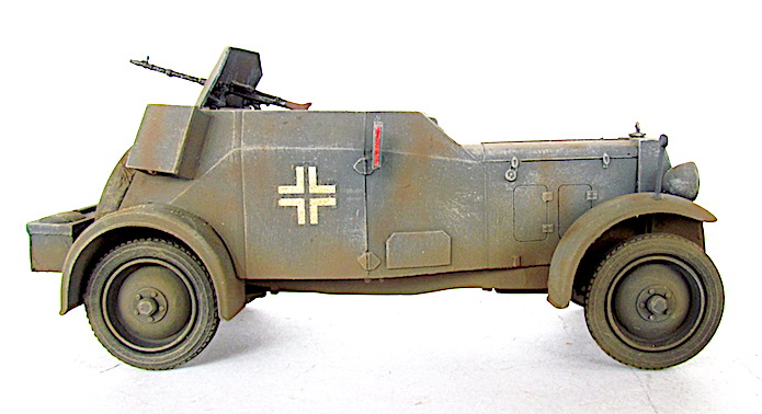 La Kfz 13, biplace, était armée d’une mitrailleuse légère montée sur pivot, protégée par un bouclier blindé et approvisionnée à 2 000 coups. Le modèle était découvert mais protégé partout ailleurs par 8 mm de blindage corroyé, sauf pour le soubassement où l’épaisseur n’était que de 5 mm. La troupe appelait ce véhicule Badewannen ("baignoire").