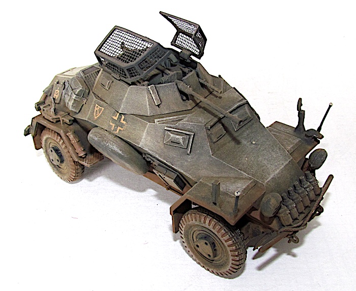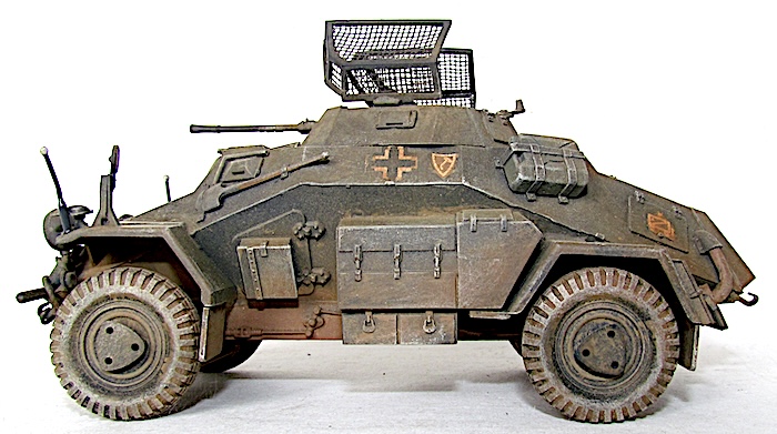 L’année suivante vit l’apparition du Sd.Kfz.222, version profondément modifiée et mieux armée. Désormais doté d’un équipage de trois hommes, il recevait un canon automatique de 2cm KwK 30 en tourelle ainsi qu’une radio de courte portée, ce qui en faisait un des blindés de reconnaissance les plus modernes de son temps. Son habitacle étroit fut partiellement compensé par des compartiments latéraux extérieurs destinés à l’équipement de l’équipage. L’armement plus puissant nécessita une tourelle agrandie, permettant d’accueillir le chef de bord et l’opérateur radio, installé à l’avant de la caisse. Afin de protéger l’équipage contre les grenades, le toit de la tourelle fut recouvert de grilles métalliques pliantes.