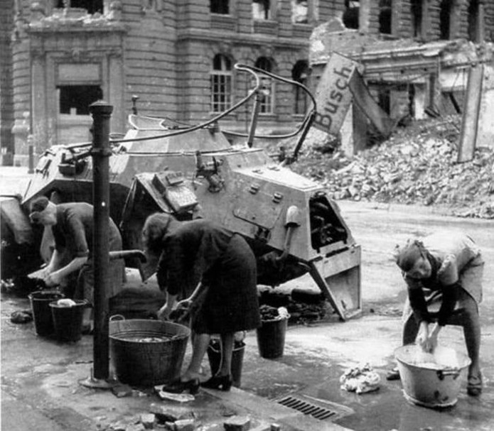 Pendant ce temps, les Soviétiques lancent leur assaut principal contre le secteur du parc de Treptow, où se trouvent les restes du bataillon de pionniers et le reliquat des chars de la SS-Panzer-Abteilung 11 « Herman von Salza ». C’est le SS-Obersturmbannführer Kausch qui contre-attaque avec ses blindés et réussit à enrayer l’avance ennemie, aux prix de ses derniers véhicules. A la date du 26, les défenseurs se tiennent autour de la Chancellerie, entre la Friedrichstrasse et la Leipzgerstrasse. D’autres éléments se battent près de la porte de Cottbus. Le 27, le régiment « Danmark » est submergé sur la Friedrichstrasse. Quelques Scandinaves combattent dans le périmètre du Reichstag et causent de lourdes pertes chez les Soviétiques. Les jours suivants, les derniers survivants tiennent toujours contre toute attente. Le 30 avril, le nouveau commandant de la division, le SS-Brigadenführer Krukenberg, informé du suicide d’Hitler, ordonne à ses derniers rescapés de percer vers l’Ouest. Si quelques petits groupes parviennent jusqu’aux lignes américaines, à Charlottenburg, la plupart des unités – telle la 3./SS-Panzer-Aufklärung 11 engagés dans une lutte sans espoir, tombent aux mains des Soviétiques