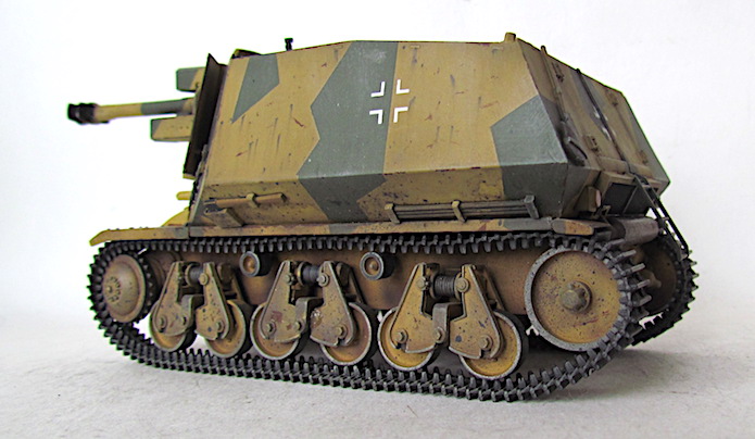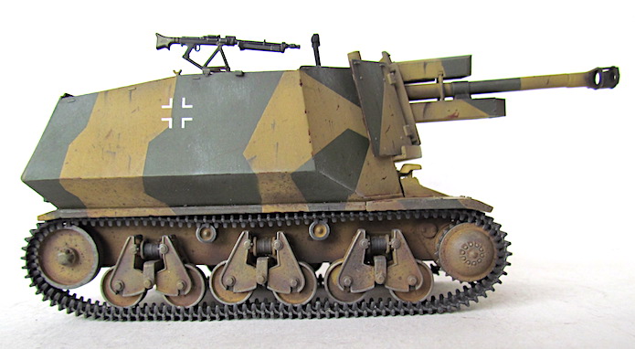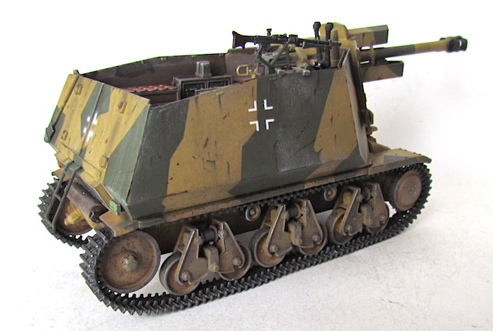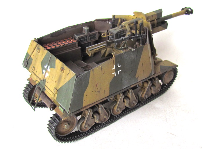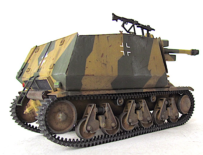 Le Baukommando Becker développe un canon automoteur armé d’un obusier de 10,5cm LeFH18 de 28 calibres, dont l’obus est capable de détruire des bunkers. Bien que dattant de la Première Guerre mondiale , cette pièce d’artillerie est puissante et souple d’emploi. La trajectoire courbe de ses obus de 14,8 kilogrammes lui permet de prendre partie les objectifs placés derrière des obstacles. Le tube présente une élévation maximale de +22° (-5° en site négatif. Selon la nature du projectile employé, la vitesse initiale varie de 470 à 540 m/s. Cette arme fait preuve d’une réelle polyvalence avec pas moins de 28 obus différents disponibles. Les Allemands estiment que cette bouche à feu a une durée de vie de 10 000 coups avant de devoir être remplacée. L’obusier peut même utiliser des munitions de prise d’origines française ou tchécoslovaque. Après suppression de la tourelle d’un Hotchkiss H39 capturé à l’armée française après la défaite de mai 1940, un obusier de 10,5cm est installé dans une casemate ouverte sur le dessus. La protection frontale de la superstructure s’élève à seulement 20 mm. D’un poids de 12,5 tonnes, le 10,5cm Le FH18 (Sf.)Geschützwagen 39H(f) n’est cependant pas destiné à, opérer au contact de l’adversaire et son blindage ne met à l’abri que des éclats d’obus. 24* exemplaires seront assemblés par la Baukommando Becker.