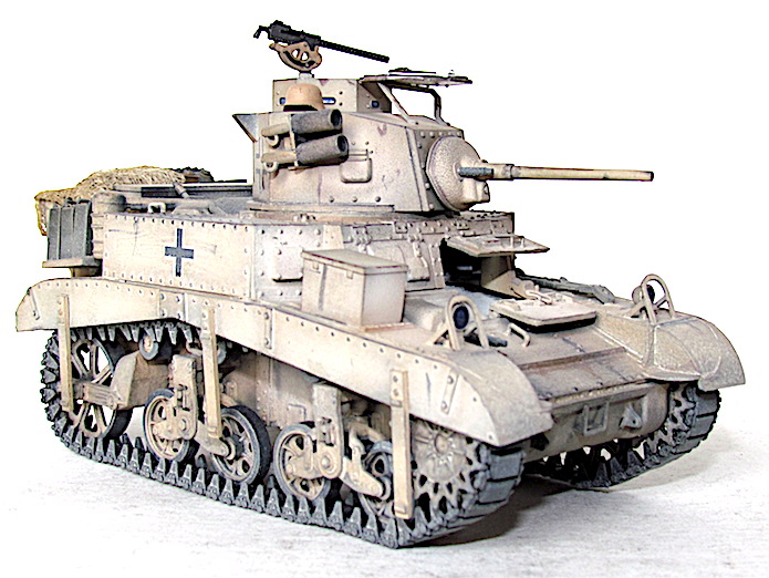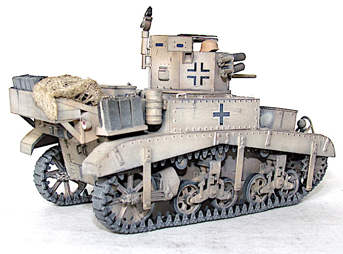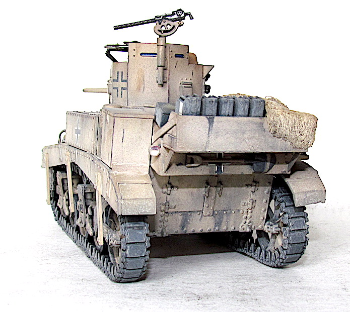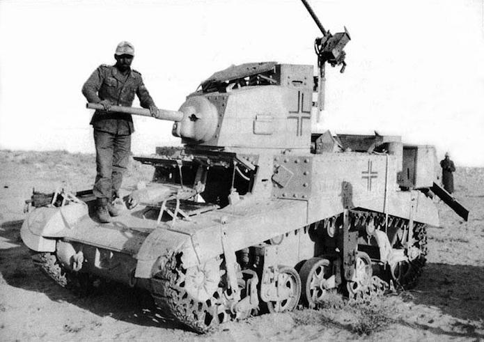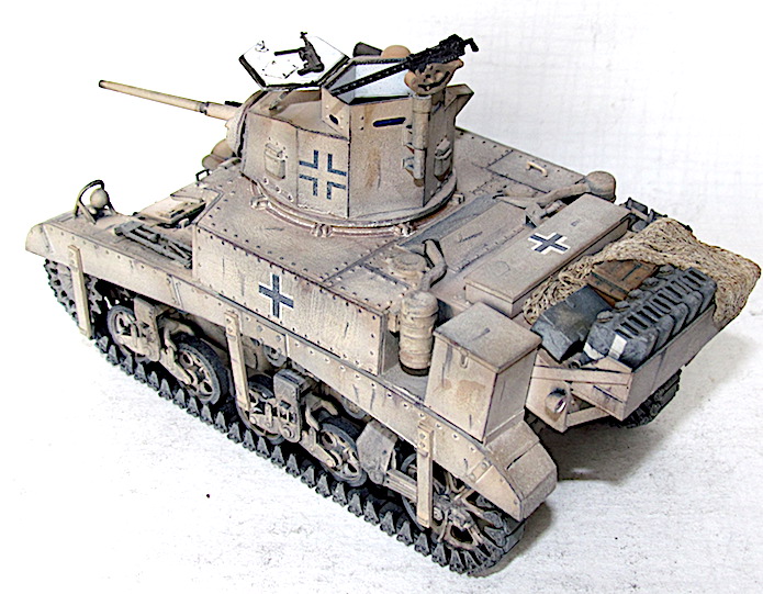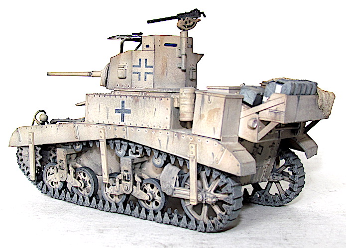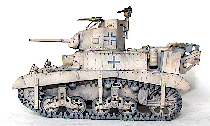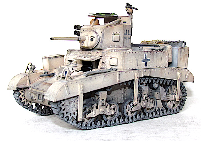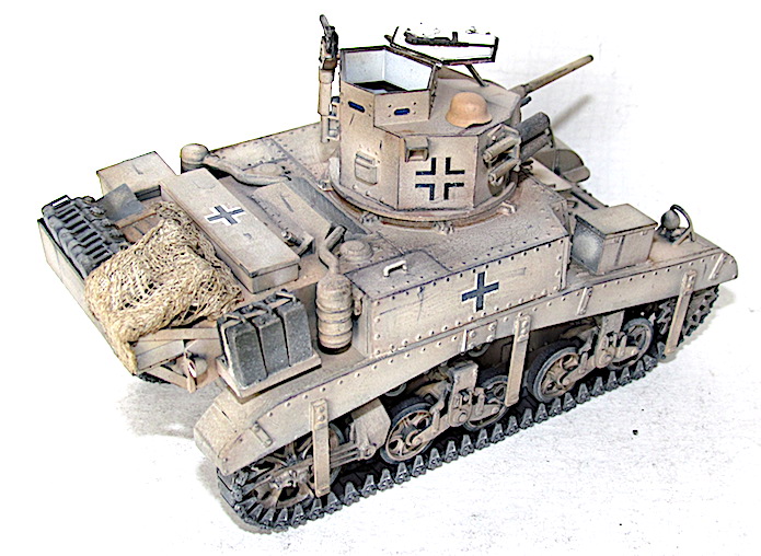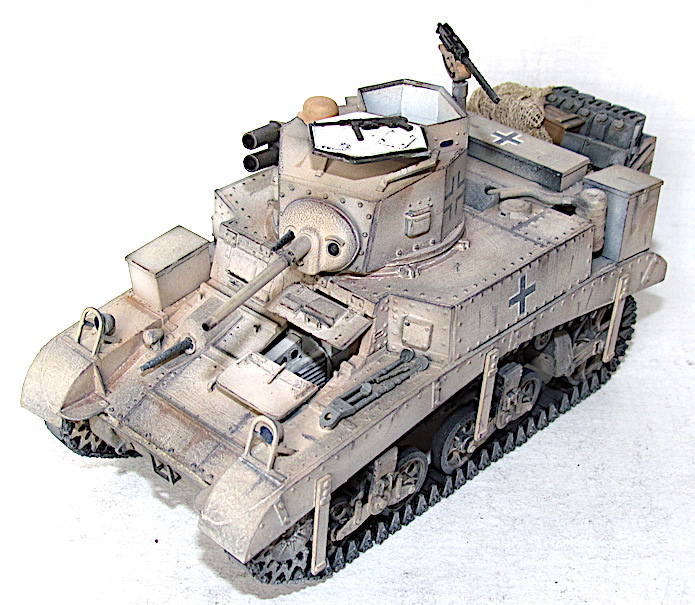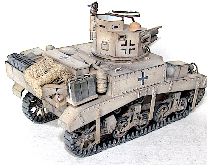Le M3 Stuart a été fourni aux forces britanniques et du Commonwealth en prêts-bails avant l'entrée des États-Unis dans la guerre. Le nom Stuart donné par les Britanniques vient du général confédéré américain J.E.B. Stuart et a été utilisé à la fois pour le M3 et le char léger dérivé M5. Dans l’armée britannique, il avait également le surnom officieux de Honey après que le conducteur du char ai fait remarquer « She's a Honey » ; dans la campagne d'Afrique du Nord. Le déploiement opérationnel a révélé que le M3 avait plusieurs défauts techniques (canon principal faible et mauvaise disposition interne). L'équipage de la tourelle de deux hommes était également une faiblesse importante. Le Stuart avait également un rayon d’action limité, ce qui était un grave problème dans la guerre très mobile du désert. Du côté positif, les équipages ont apprécié sa vitesse relativement élevée et sa fiabilité mécanique. Ce véhicule capturé a conservé sa couleur jaune sable britannique d'origine. Seuls les insignes nationaux allemands ont été ajoutés. Au moins six de ces chars légers ont servi avec le Kampfstaffel des Oberbefehlshabers des Panzerarmee Afrika.