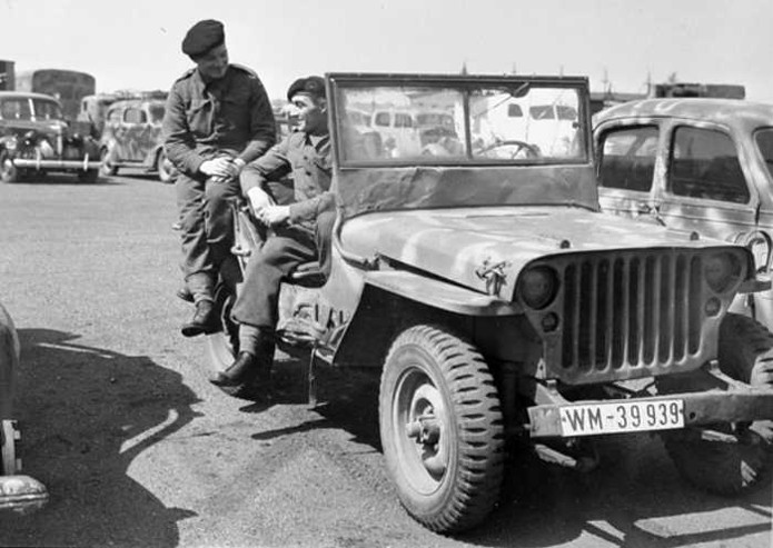 Dans un dépôt regroupant de nombreux véhicules de liaisons ou d’état-major, nos deux soldats anglophones semblent heureux d’avoir retrouvé cette jeep capturée, repeinte et immatriculée avec une plaque de la Marine de guerre.