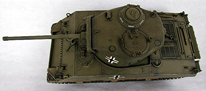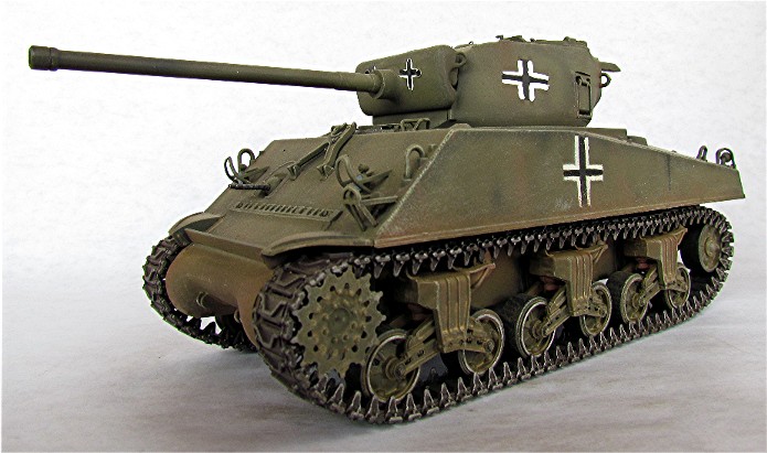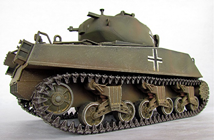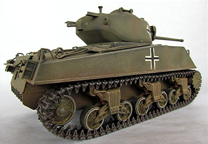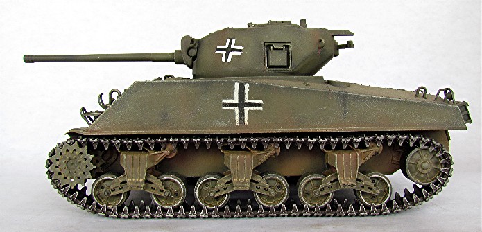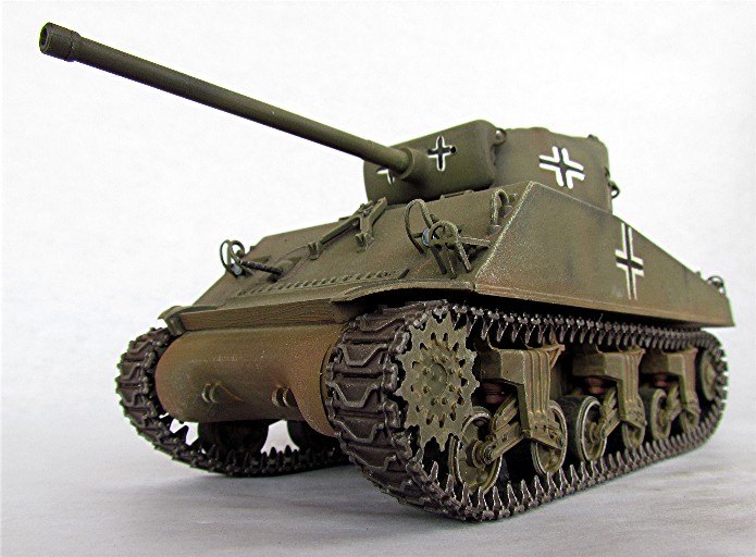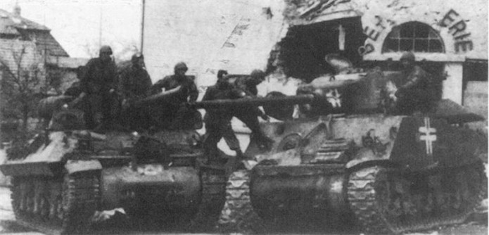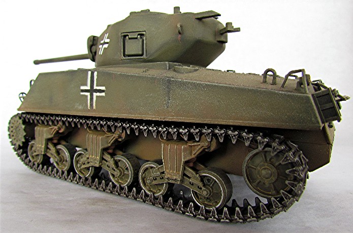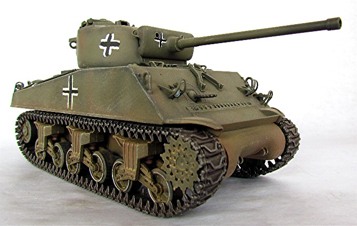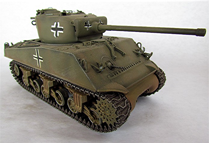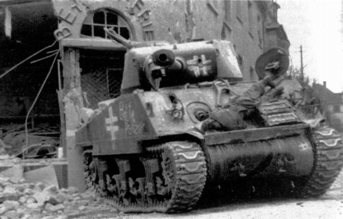 A fin d’identification et pour éviter des tirs fratricides, les Allemands avaient peints sur les flancs et la tourelle du M4A3 (76) des croix balkaniques et apposés l’inscription «beute panzer ». Le char a été détruit par obus de 90mm qui a perforé le glacis avant juste au-dessus du phare droit.