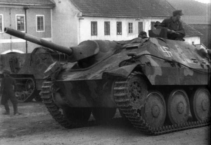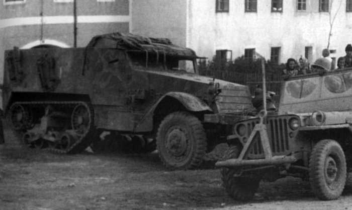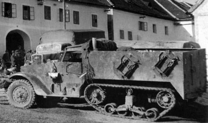 7 mai 1945, la capitulation est proche, des éléments de la 11. Pz. Division se rendent aux troupes américaines près de Schwarzbach à la frontière austro/tchèque.Outre un Hetzer et plusieurs véhicules à roue, on trouve aussi ce M-3 transport de personnel capturé en décembre 1944 et appartenant au 10. (Pi.)/Pz gren Rgt 111. Le véhicule a été modifié par l’ajout de quatre supports pivotants pour Wurfrahmen 40.