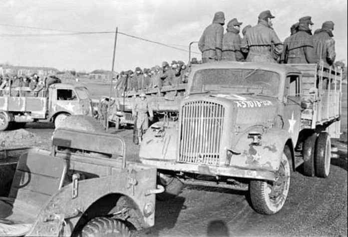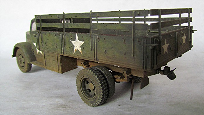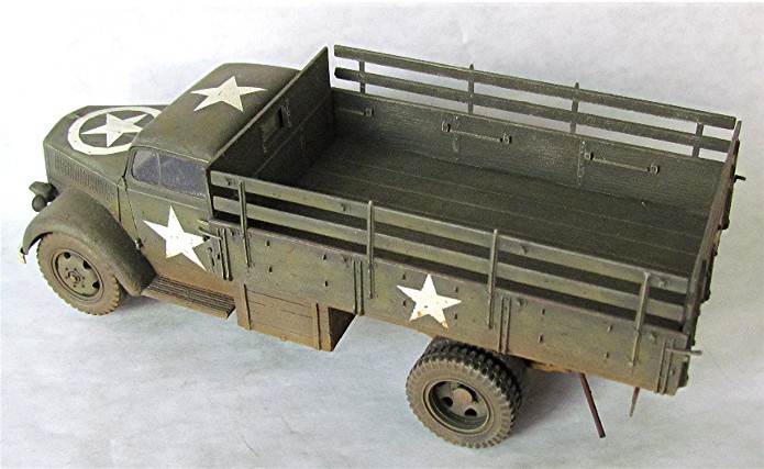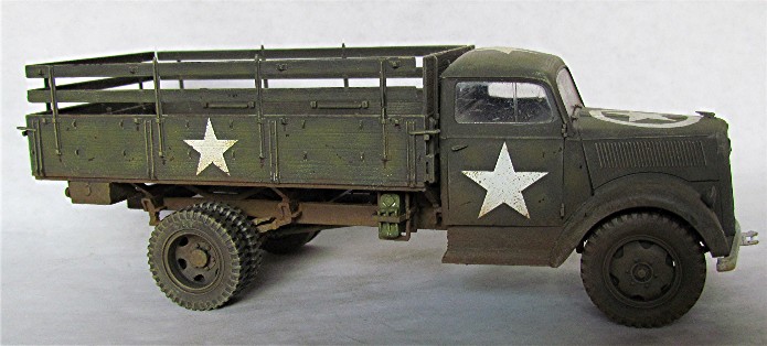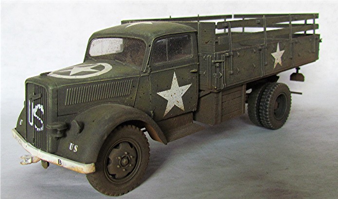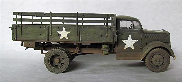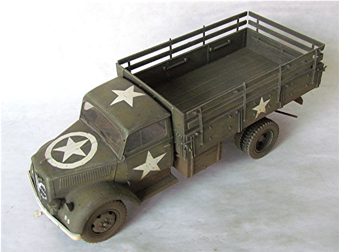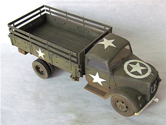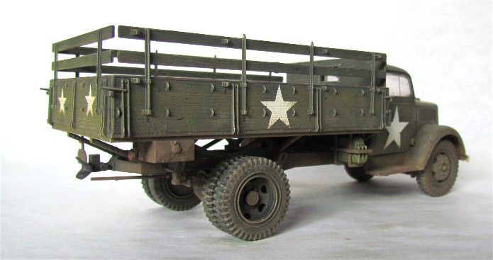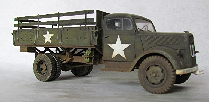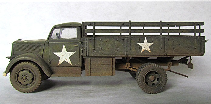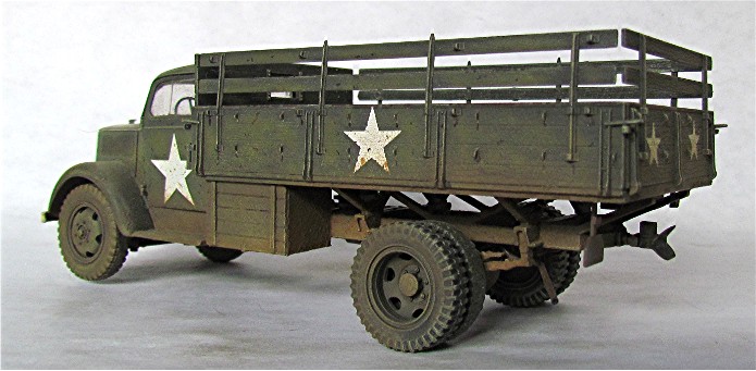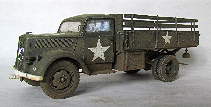 Véritable bête de somme de l’armée allemande, l’Opel Blitz fut construit à plus de 82 000 exemplaires toutes versions confondues entre 1937 et 1944. Fiable et rustique, il sera présent sur tous les champs de bataille. Routes de France, sables du désert, neige et boue de Russie seront marqués par l’empreinte de ses roues qu’il soit en version 4x2 ou 4x4. Jusqu'à la fin de la guerre, il ne subira que quelques modifications mineures dont la plus visible sera le remplacement d’une cabine métallique par une en carton et bois, économie de fin de guerre oblige. En 1944/1945, les Allemands, lors de leur retraite, laisse sur le terrain un important charroi dont certains matériels sont encore en état de marche. Les alliés n’hésiteront pas à retourner ce parc automobile contre l’ancien propriétaire. L’Opel Blitz fera parti de ces prises et endossera la couleur kaki. L’application de nombreuses étoiles blanche sera faite pour éviter toute méprise. L’aviation alliée, en maraude avait vite fait de lâcher une rafale sur tout véhicule suspect.