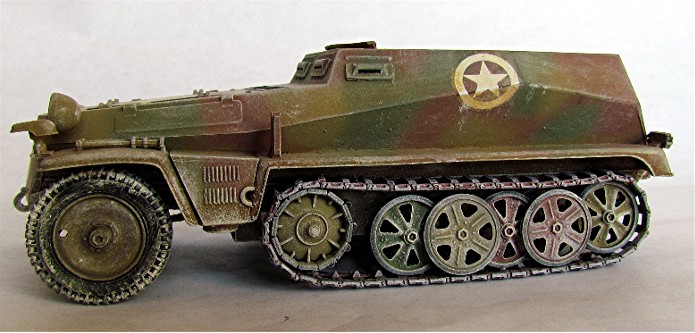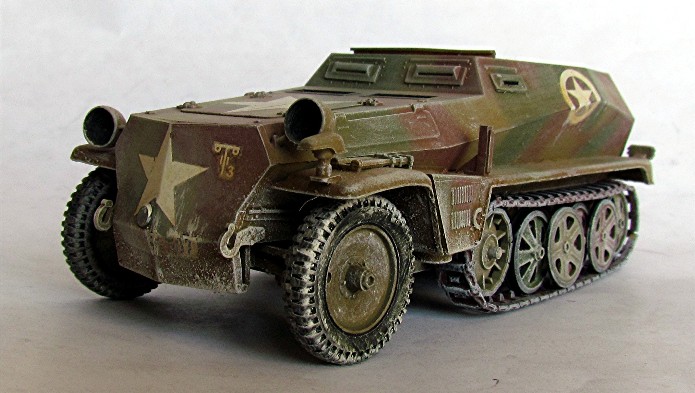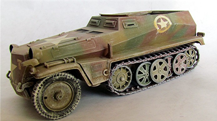 Lors de la contre-offensive dans les Ardennes en 1945, les forces alliées récupèrent lors de difficiles combats dans la neige et par des températures extrêmes le terrain perdu quelques semaines auparavant sous l’assaut des unités allemandes engagées dans l’offensive " Wach am Rhein ". Les troupes allemandes à bout de souffle retraitent en laissant derrière elles de nombreux matériels dont ce SDKFZ 250. La présence d’étoiles blanches a donné pour interprétation une appartenance de ce véhicule à la 150e Panzer Brigade de Skorzeny. Lors de l’opération " Greif ", du matériel américain, jeeps en particulier et d’autres matériels allemands camouflés en pseudo chars américains par ajout de plaques de blindage (Panther déguisé en M-10 et Stug III) et d’étoiles sont utilisés pour induire les soldats américains en erreur. En dotation, on trouve aussi des semi-chenillés au sein de la PanzerBrigade. Les photos prises après la bataille montrent ces engins peints en vert sombre et affublés d’étoiles américaines. Les pseudo Panther-M10 et Stug III portent même un marquage détaillé les faisant passer pour des chars du 10th Tank Battalion , 5th Armoured Division. Tous les autres marquages d’origine allemande sont effacés. L’engin photographié à Samrée en Belgique porte encore son immatriculation allemande …87 et surtout son symbole tactique pouvant être celui d’un bataillon d’artillerie d’une unité mécanisée. L’engin porte un camouflage fait de plusieurs colories dont au moins une couleur claire et une sombre. La 150e PanzerBrigade a surtout été engagée dans le secteur de Malmedy où elle perd la majorité de ces blindés en essayant de capturer la ville. Samrée est située près de la Roche en Ardenne donc assez loin de Malmédy. 150e PanzerBrigade ou autre unité, le débat reste ouvert.