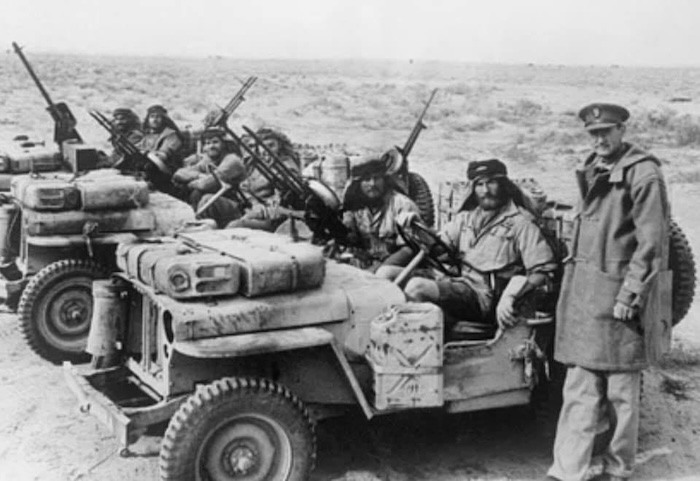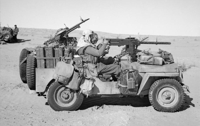 C’est alors que le SAS collabore étroitement avec le Long Range Desert Group (LRDG), une unité spécialisée dans la navigation et les longues patrouilles en territoire désertique. Le LRDG transporte les commandos du SAS au cœur du désert, parfois à des centaines de kilomètres derrière les lignes ennemies. Mais rapidement, le SAS cherche à gagner en autonomie. À partir de 1942, les Britanniques reçoivent des véhicules américains dans le cadre du programme d’aide alliée. Parmi eux, la célèbre Willys MB Jeep va devenir l’outil emblématique du SAS. Loin de se contenter de les utiliser telles quelles, les commandos les transforment en profondeur. Les pare-brises sont retirés pour alléger le véhicule, des jerricans supplémentaires sont fixés pour augmenter l’autonomie, et surtout, plusieurs mitrailleuses sont installées à bord, notamment les redoutables Vickers K. Chaque Jeep devient ainsi une véritable plateforme de combat mobile, rapide et redoutablement efficace.