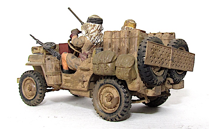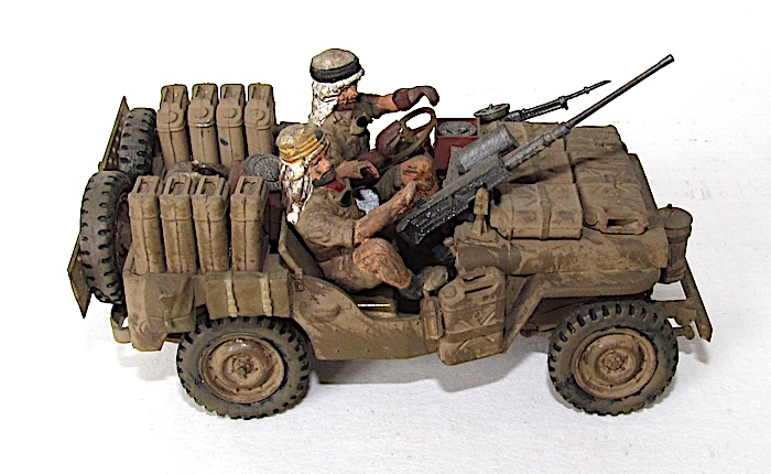 La Willys MB Jeep utilisée par le Special Air Service en Afrique du Nord (1942–1943) illustre parfaitement l’adaptation d’un matériel standard à une guerre atypique. Conçue à l’origine comme véhicule léger de reconnaissance, robuste et mobile, elle devient entre les mains du SAS une plateforme de combat polyvalente, taillée pour les immensités désertiques.Allégée au maximum — pare-brise et éléments superflus supprimés — la Jeep gagne en mobilité et en fiabilité sur des terrains difficiles. Sa transformation la plus décisive concerne l’autonomie : saturée de jerricans d’essence et d’eau, elle peut parcourir plus de 1 000 kilomètres, rendant possibles des raids très en profondeur, loin de toute base logistique. À cela s’ajoutent des adaptations spécifiques au désert : filtres à air renforcés, équipements de navigation rudimentaires mais efficaces, et matériel de désensablement.
