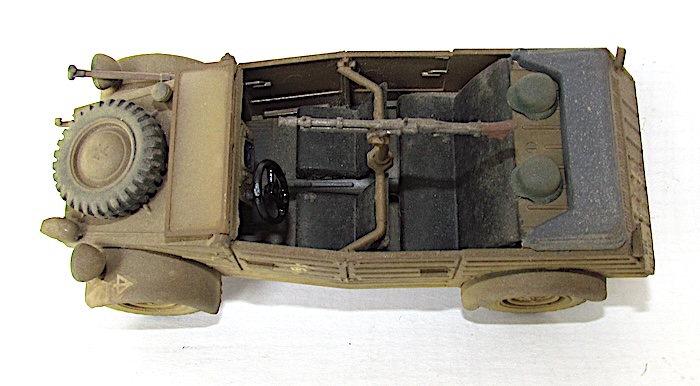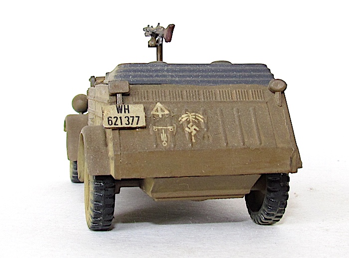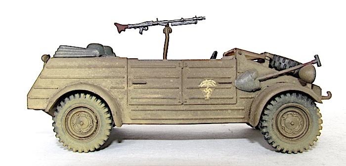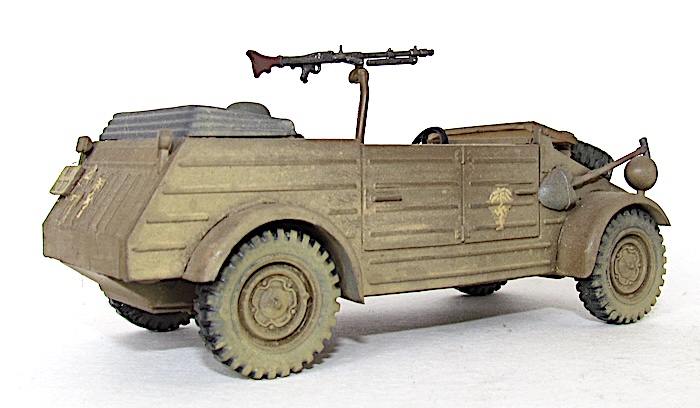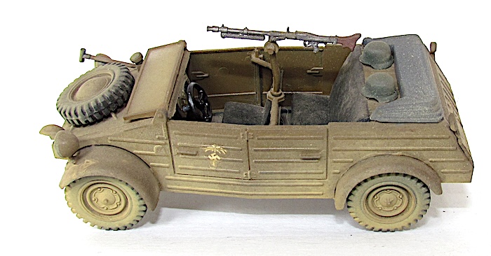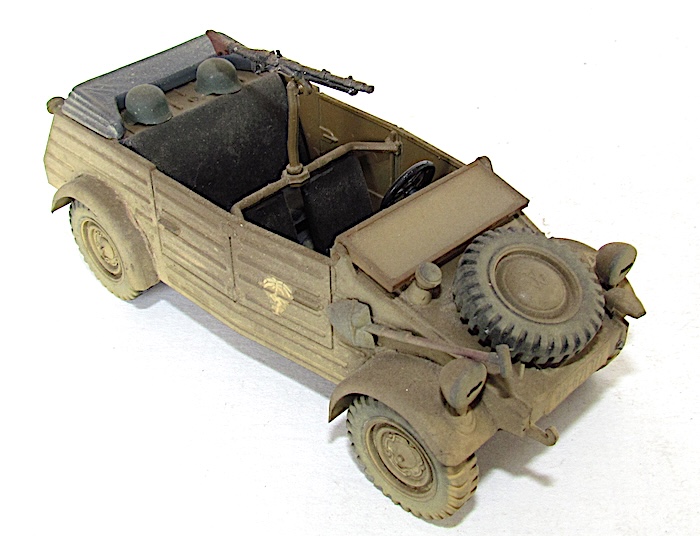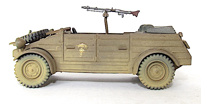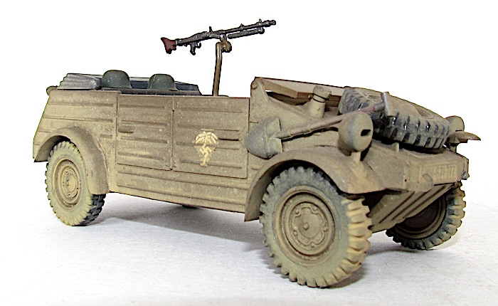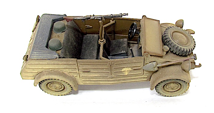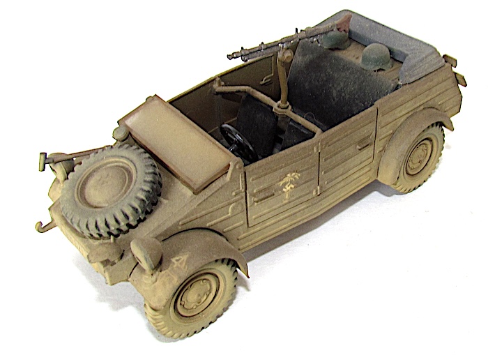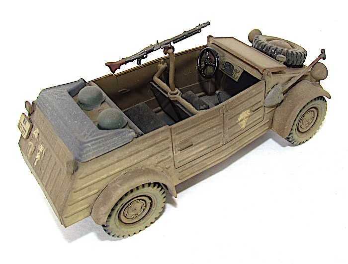 En 1933, Hitler demanda à deux concepteurs d’automobiles — le Dr Porsche (Auto-Union) et Werlin (Mercedes-Benz) — de mettre au point une « voiture du peuple » (Volkswagen). Elle prit forme dès 1934 sur la table à dessin du Dr Porsche.Les premiers plans d’une version tout-terrain, désignée Volkswagen Typ 62, furent élaborés en 1936. Lorsque la décision fut prise de faire de la Volkswagen le seul nouveau véhicule transporteur de personnel de la Wehrmacht, destiné à devenir la voiture standard de toutes les armes, quelques modifications de conception furent décidées. Le nouveau véhicule reçut la désignation Typ 82.En 1938, les travaux pour bâtir les usines Volkswagen de Wolfsburg furent entrepris, et la production commença en mars 1940.Les autorités militaires allemandes adoptèrent ce véhicule pour sa légèreté et sa facilité de fabrication. Conçue avec des moyens peu onéreux, la Kübelwagen ne comportait que des éléments simples. Sa configuration était très proche de celle de la Jeep. Grâce à sa suspension et à son différentiel autobloquant, elle offrait d’excellentes performances tout-terrain.Les principales difficultés techniques une fois réglées, la Volkswagen Typ 1, avec son moteur de 998 cm³, quatre cylindres à refroidissement par air, devint rapidement un véhicule des plus fiables.Avec ses excellentes qualités automotrices et son entretien facile, la Kübelwagen répondit pleinement aux exigences de l’armée, aussi bien dans les campagnes du désert que sur le front soviétique.La version militaire possédait une carrosserie en plaques de métal, avec quatre portières. Une capote de toile repliable et des protections latérales transparentes mettaient les passagers à l’abri des intempéries. Les tôles étaient fixées sur une armature tubulaire constituant la base du véhicule.